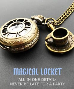Embrace your inner queen/king with this vintage style pocket watch necklace inspired by Alice in Wonderland. The bronze tone pendant features a delicate design and comes with a 30″ chain. Perfect for cosplay, gothic lolita outfits, and as a unique gift idea for special occasions.