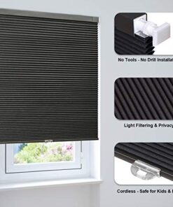 No drill installation with patented No Tools-No Drill system. Real blackout shades with silver-plated layer for complete sunlight blockage. Cordless design for safety, easy to raise and lower. Insulating and noise-reducing for a comfortable environment.