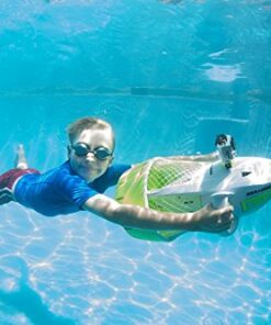 Perfect for snorkeling or shallow diving. Speeds up to 2.5 mph and depth of 30ft. Lightweight design for easy transport. Features safety grille, auto shutoff, and dual trigger operation. Up to 1.5 hours of run time per charge with a 6-month warranty.