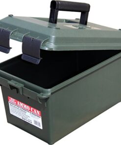 Compact and durable ammo can with dual latches and padlock tabs. Made in the USA with rugged polypropylene plastic. Ideal for geocaching, moisture-resistant, and stackable design. Dimensions: 8.75" x 15.5" x 9".