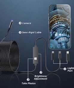 Inspect hard-to-reach places effortlessly with this high-resolution endoscope. Easy connection to iOS and Android devices. Semi-rigid and waterproof design for versatile use. Suitable for car maintenance, pipe inspection, and more. Comes with various accessories for added convenience.